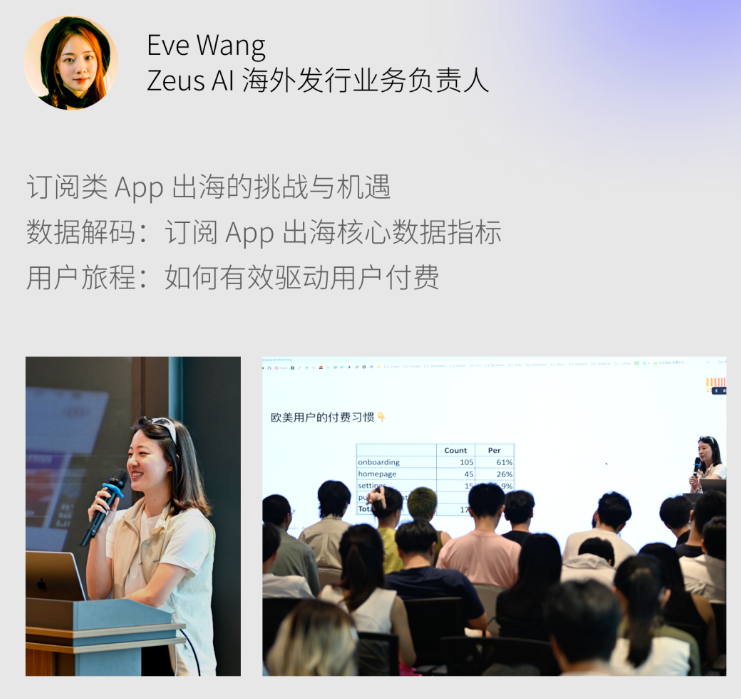 这部分很适合所有想出海的人听。Eve 的核心观点是:选国家之前先看品类。社交类产品可能更适合先打东南亚、中东,因为需求更明确、成本更低;而 iOS 订阅类产品,通常更适合直接从欧美起步,尤其是美国,因为 benchmark 更清晰、验证效率更高。至于日本,她认为有价值,但对很多订阅类产品来说,天花板可能没有大家想象中那么高。
