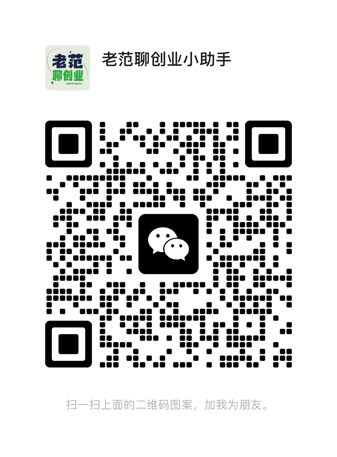 加入方式,扫码或微信搜索:lflcyxzs(老范聊创业小助手首字母小写),备注公司和姓名,小助手上线后会拉你进群。