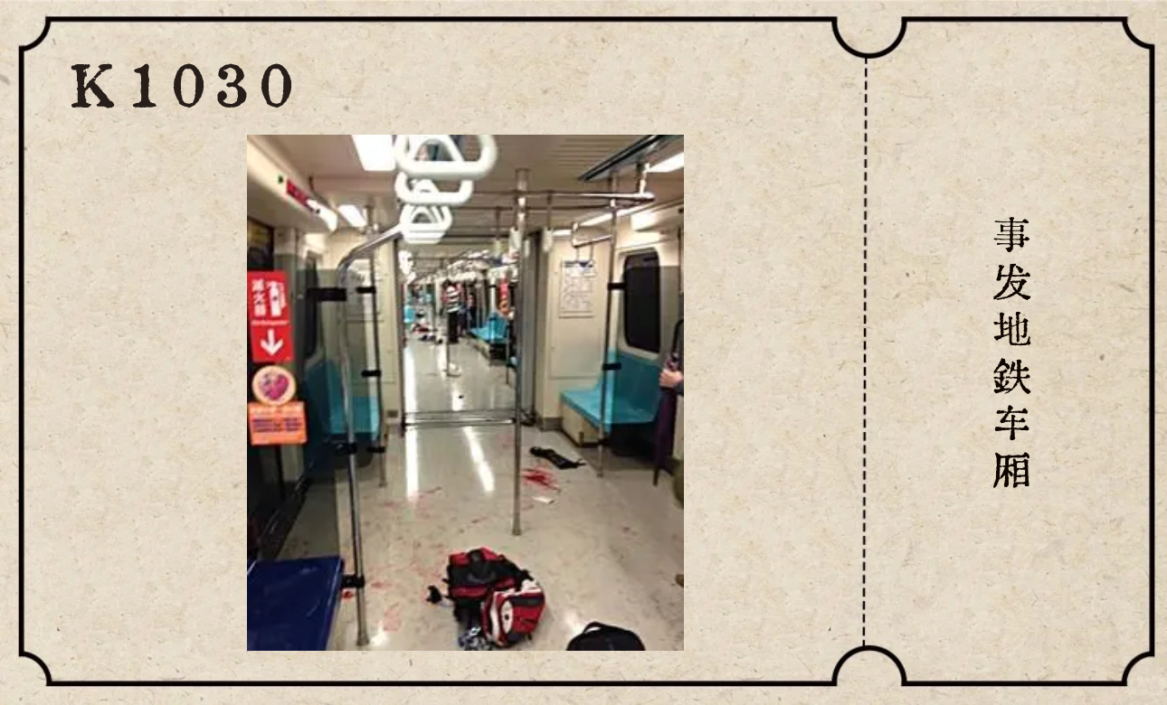一辆列车准时停靠在捷运站台,车门打开后,乘客们哭喊着拼命往外跑。仔细看,乘客中有人受了伤,鲜血直流。车厢里,还有乘客已经倒下。